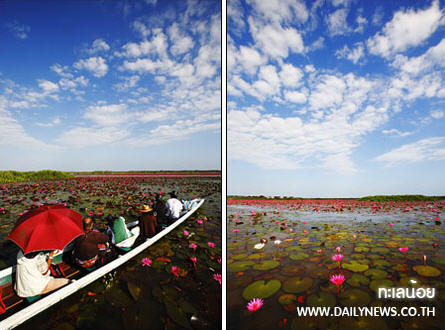 เรือหางยาว 4 - 5 ลำ ทยอยออกจากท่าเรือมาได้สักระยะ ก็เริ่มพบกับดงบัวสายสีชมพูสดบานสะพรั่งเต็มผืนน้ำ พระอาทิตย์ดวงกลมโตสาดแสงเปรี้ยงเข้าให้กลางลำเรือ ไม่รู้จะหลบไปทางไหน ทำได้แค่เพียงนำหมวกมาปิดอำพรางใบหน้าขาวใสไว้เท่านั้น ก่อนที่มันจะดำเกรียมจนไม่น่ามอง