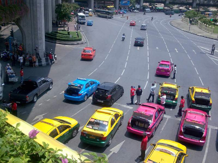 14:07 น. TAXI ป่วน! รวมพลใช้รถจอดปิดเส้นทางการจราจรทุกเส้นทางมุ่งหน้าเข้าอนุสาวรีย์ชัยสมรภูมิ ทำจราจรอัมพาตรถติดหนึบ