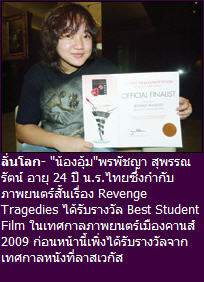 เมื่อวันที่ 24 พ.ค. น.ส.พรพัชญา สุพรรณรัตน์ อายุ 24 ปี ผู้กำกับฯ หนังสั้นชาวไทย ซึ่งเป็นคนไทยคนแรกที่อายุน้อยที่สุดที่ได้รับรางวัล "Best Student Film" และ "Official Selection" จากหนัง "Revenge Tragedies" และ "Unfaithfully Yours" จากเทศกาลภาพยนตร์ "คานส์ อินเตอร์เนชั่นแนล ฟิล์ม เฟสติวัล 2009" ที่จัดขึ้นในวันที่ 13-24 พ.ค.ที่ประเทศฝรั่งเศส เปิดใจให้สัมภาษณ์ "ข่าวสด" ถึงเบื้องหลังความสำเร็จครั้งนี้
