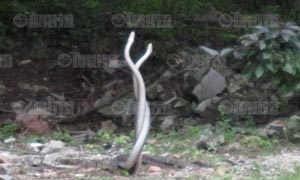 วันนี้ (20 มิ.ย.) เมื่อเวลา 10.35 น. นายบุญศรี วงติ่ง อายุ 44 ปีอยู่บ้านเลขที่ 90/1 หมู่ 5 ต.ท่ามะ ขาม อ.เมือง จ.กาญจนบุรี ได้นำภาพถ่ายมาให้ผู้สื่อข่าวได้ดูภาพงูจงอางขนาดใหญ่ มีความยาวประมาณ 3 เมตรเศษๆ ซึ่งกำลังพันตัวกันแล้วชูหัวขึ้นฟ้า สูงประมาณ 1 เมตรเศษ มีความสวยงามมาก ซึ่งนับว่าเป็นปรากฏการณ์ ที่ไม่เคยพบมาก่อน
