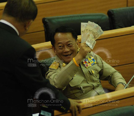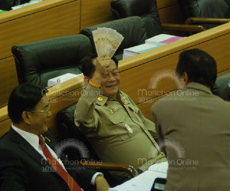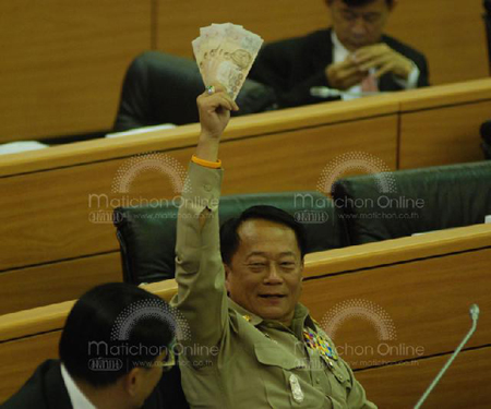 หลังจากอภิปรายจบลงจึงประกาศว่า "ใครตบหัวผู้ประท้วงผมจะให้เงิน 5,000 บาท"