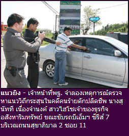 จากนั้นจึงเดินทางไปที่เกิดเหตุ บริเวณถนนสุขาภิบาล 2 ซอย 11 แขวงประเวศ เขตประเวศ กทม. เพื่อจำลองสถานที่และวิถีกระสุน โดยใช้สติ๊กเกอร์ทางวิทยาศาสตร์ติดบริเวณกระจกฝั่งขวาด้านคนขับ เริ่มจากจุดแรก เป็นจุดที่คนร้ายลงมือยิง 2 นัด มีความสูงจากพื้น 111 เซนติเมตร ห่างจากขอบกระจกประมาณ 25 เซนติเมตร หลังจากถูกยิงแล้วรถเลื่อนไปด้านหน้าเล็กน้อย คนร้ายยิงต่อเป็นนัดที่ 3 ห่างจากขอบกระจก 10 เซนติเมตร โดยยิงในระยะความสูงประมาณ 30 องศา