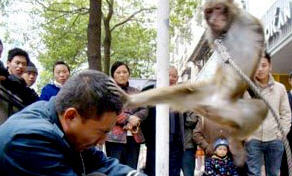 ศูนย์การค้าในเมืองเอินสี มณฑลเหอเป่ย จ้างคณะ "กังฟูวานร" ของ นายหลอ วุ้ง แสดงโชว์ศิลปะมวยกังฟู เพื่อดึงดูดลูกค้าเข้าไปช็อปปิ้งจับจ่ายใช้เงิน