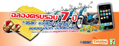 ได้แก่ สินค้าที่วางจำหน่ายในร้านค้า 7-Eleven ตั้งแต่วันที่ 16 ธ.ค.52 - 21 ม.ค.53 นี้เท่านั้นซื้อสินค้าภายใต้ยี่ห้อ ASAKI ในร้าน 7-ELEVEN (On Shelf) ตั้งแต่ 198 บาทขึ้นไปต่อหนึ่งใบเสร็จ(หากใบเสร็จ 1ใบ มีสินค้ามากกว่า1รายการให้ตัดชิ้นส่วนข้อความ สคบ. สินค้าAsaki ทุกรายการแนบมาด้วย)ได้แก่สินค้าที่วางจำหน่ายในร้านค้า 7-Eleven ตั้งแต่วันที่ 16 ธ.ค.52 - 21 ม.ค.53 นี้เท่านั้น
