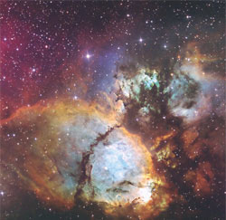 8. ดาวร้อนแรงแสงเปล่งประกายออกมาจากกลุ่มเนบิวลา "เอ็นจีซี 6164" ภายในมีดาวกลุ่ม "โอ" (O-type Star) ตั้งอยู่ โดยมีมวลและความร้อนสูงมากกว่าดาวอาทิตย์ประมาณ 40 เท่า และคาดว่าดาวดวงนี้มีอายุไม่ต่ำกว่า 3-4 ล้านปี