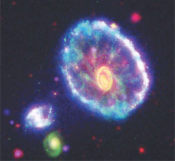 4. แมงกะพรุนเรืองแสงกาแลกซี หรือ ดาราจักร "คาร์ทวีล" ดูคล้ายแมงกะพรุนเรืองแสงลอยอยู่ในจักรวาล ภาพๆ นี้ได้จากการนำภาพจากกล้องฮับเบิล กกล้องโทรทรรศน์สปิตเซอร์ กล้องจันทราเอ็กซ์เรย์ มาประกอบเข้าด้วยกัน