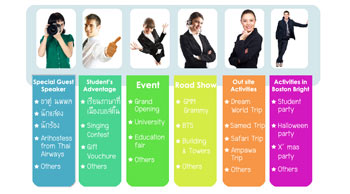 5. Variety of Classes: บอสตั้น ไบรท์ มีการเรียนการสอน ที่ประกอบไปด้วยกิจกรรมมากมาย ทั้งในและนอกสถานที่ เพื่อเพิ่มโอกาสให้นักเรียนได้ฝึกการใช้ภาษาเชิงประยุกต์