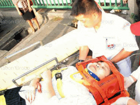 นพ.นราธิป กล่าวด้วยว่า ส่วนอาการนั้นพบว่า มีบาดแผลฉีดขาดที่ศีรษะด้านซ้าย จำนวน 2 แห่ง แผลฉีกขาดยาว 3 ซม.และ 6 ซม. หลังใบหูซ้าย มีแผลฉีกขาดยาว 6 ซม.ต้องเย็บถึง 20 เข็ม กระดูกฝ่าเท้าซ้ายแตก ขณะนี้ใส่เหล็กดามไว้แล้ว คาดว่าต้องใช้ระยะเวลาในการรักษาประมาณ 1 เดือน อาการโดยรวมปลอดภัย สำหรับสมองจากการเอ็กซ์เรย์พบว่าปกติ ไม่มีเลือดออกในสมอง ส่วนคนไข้ไม่มีโรคประจำตัว หลังจากนี้ต้องนอนดูอาการอีกซักประมาณ 3-4 วัน จึงจะอนุญาตให้กลับไปพักผ่อนที่บ้านได้