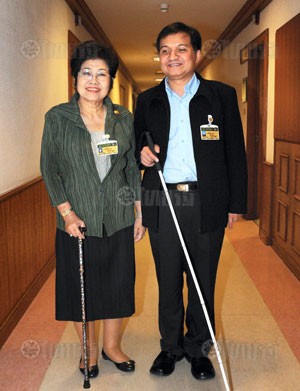 ยุวดี นิ่มสมบูรณ์ และ มณเฑียร บุญตัน นายกสมาคมคนตาบอดแห่งประเทศไทย 2 ส.ว.ในคณะกรรมาธิการการพัฒนาสังคมฯ โชว์ไม้เท้าที่มอบให้เฮติ