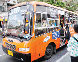 ด้าน กลุ่มตัวแทนคนจนสลัมอย่าง นางประทิน เวคะวากยานนท์ ประธานเครือข่ายสลัม 4 ภาค กล่าวว่า นอกจากการใช้รถเมล์ฟรีแล้ว ช่องทางหนึ่งที่คนจนจะสามารถเข้าถึงบริการด้านสาธารณะของการเดินทางไปไหนมาไหนก็คือรถเมล์เขียว แต่ที่ผ่านมาพบปัญหาว่าการบริการ คนขับใจร้อน ขับเร็ว จอดรถนอกป้าย คนเก็บเงิน ด่าผู้โดยสาร และ ส่วนหนึ่งเป็นปัญหาเครื่องยนต์เก่า ไม่มีการปรับปรุง ซึ่งการปรับปรุงครั้งนี้ไม่ใช่มาว่ากันเรื่องวิ่งรถสีไหนดีกว่ากัน ความจริงจะสีเหลือง สีส้ม สีเขียว ก็เหมือนกัน ประเด็นอยู่ที่การบริการที่ดี สุภาพ และ ที่สำคัญคนขับรถต้องเป็นคนที่มีศักยภาพ ไม่ประมาท บริการดี ไม่มุ่งแต่จะทำเวลา กินเปอร์เซ็นต์ วิ่งแซงกันบนท้องถนนโดยทำผิดกฎจราจร บางครั้งคนขับ กระเป๋ารถ ทะเลาะกันเรื่องแย่งผู้โดยสาร อันนี้สำคัญกว่าจะเอารถสีไหนมาวิ่ง