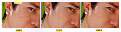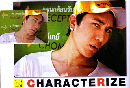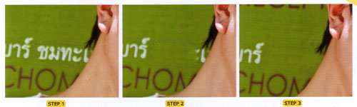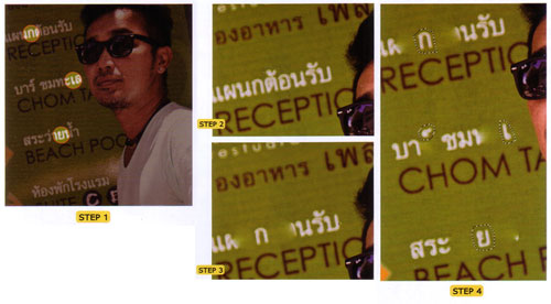 2. ลบตัวหนังสือทิ้งด้วยเครื่องมือ Patch Tool โดยใช้เครื่องมือนี้ลากรอบตัวหนังสือที่เราต้องการลบ แล้วลากส่วนที่นี้ไปยังส่วนที่เป็นพื้นเรียบ ๆ โปรแกรมจะทำการก๊อบปี้ส่วนนั้นให้โดยมีการปรับให้ขอบให้เรียบเนียนกลมกลืนไปกับพื้นเดิมอีกด้วย ส่วนพื้นที่เล็ก ๆ บริเวณผม ต้องใช้เครื่องมือ Clone Stamp เข้าช่วย