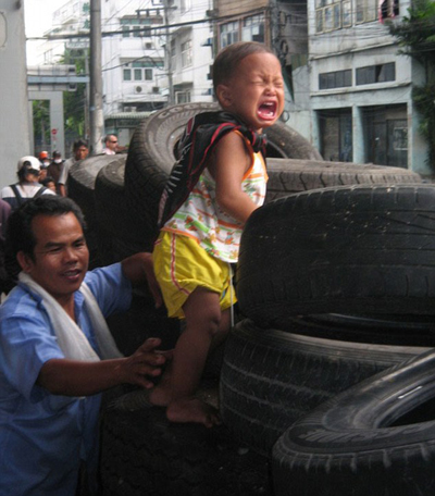 จากการแถลงการณ์ของ พ.อ.สรรเสริญ แก้วกำเนิด โฆษกศูนย์อำนวยการแก้ไขสถานการณ์ฉุกเฉิน (ศอฉ.) ที่มีการนำเสนอภาพเด็กตัวเล็กถูกจับให้นั่งอยู่บนกองยางรถยนต์ที่กลุ่มคนเสื้อแดงใช้เป็นบังเกอร์ และมีการเปิดเผยว่าทางทหารไม่สามารถทำอะไรได้ เนื่องจากกลุ่มคนเสื้อแดงมีการใช้เด็กเป็นโล่ห์มนุษย์