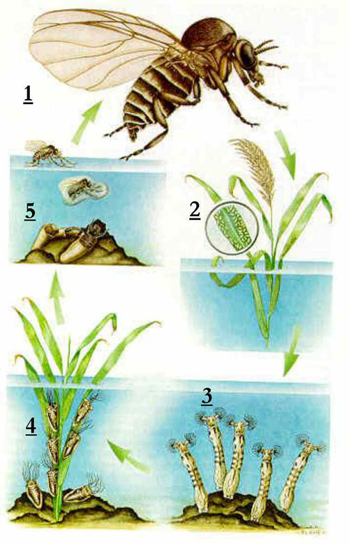 วงจรชีวิตของริ้นดำ ได้แก่ 1. วางไข่ 2. ไข่ 3. ตัวอ่อน 4. ดักแด้ และ 5. ตัวเต็มวัย