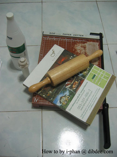 กาวน้ำชนิดใส , ไม้รีดแป้ง (ที่เค้าใช้ทำขนม) , ที่ตัดกระดาษ , หนังสือเล่มหนา ๆ