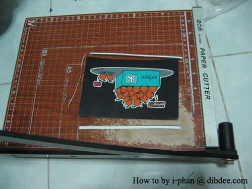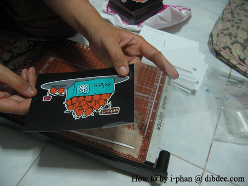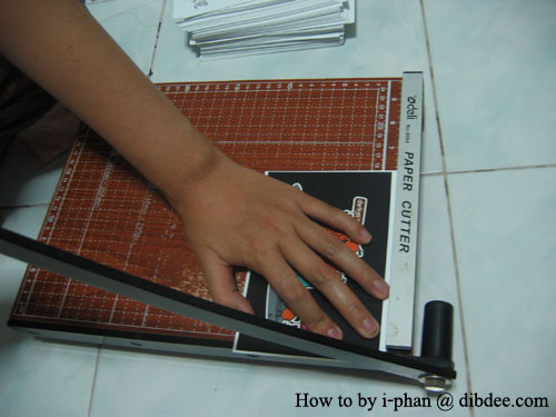 ตัดขอบกระดาษที่เลื่อมกันออก ควรตัดส่วนที่เป็นรูปออกด้วยนิดหน่อย เพื่อความเสมอภาค ดูไม่ออกว่าอันไหนชั้นเธอ ( รูป ) อันไหนชั้นชั้น ( กระดาษ ) ไม่ต้องเสียดายรูปหรอกค่ะ ตัดออกนิดเดียวเอง เวลาออกแบบ อย่า..เอาตัวหนังสือติดขอบมากนะจ๊ะ เวลาตัดจะได้ไม่กลัวแหว่ง ไม่มีที่ตัดกระดาษ ใช้คัตเตอร์ตัดได้ หรือใช้คนอื่นตัดน่าจะดีกว่า ฮ่า ๆ