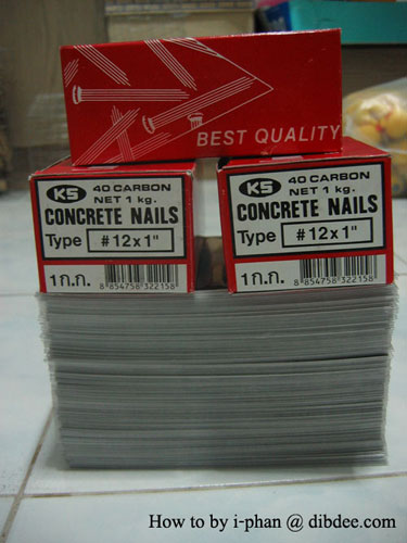 จับเรียงทุกใบเข้าด้วยกัน หาของหนัก ๆ มาทับเพื่อให้การ์ดเรียบไม่โค้งงอ ( ในรูปเป็นตะปูคอนกรีตหนักกล่องละ 1 กก. ) ทิ้งไว้ข้ามคืนยิ่งดีค่ะ