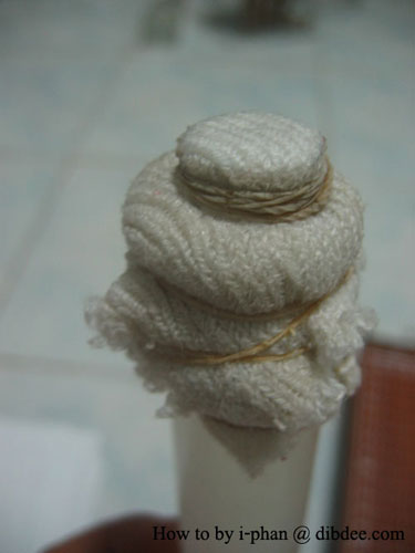 กาวน้ำที่ซื้อตามร้านเครื่องเขียน ด้านบนจะเป็นฟองน้ำแผ่นบาง ๆ รูค่อนข้างกว้าง เวลาทากาว จะทะลักออกมาเยอะเกินความจำเป็น อีกอย่างจะทำให้เลอะรูป เสียหายได้ง่าย แป้นใช้เทคนิค "กั้นกาว" โดยนำเศษผ้ามาปิดทับอีก 2 ชั้น รัดด้วยหนังยางไฮโซมาก พันอยู่หลายตลบเพื่อให้กาวซึมออกมาน้อยและทาได้บางที่สุดจ้ะ