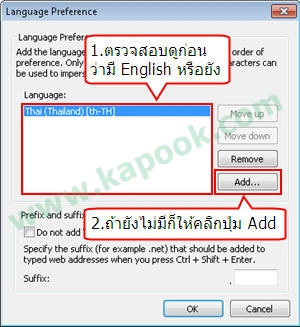 3. ตรวจสอบดูก่อนว่ามี Enlish อยู่หรือไม่ ถ้ามีอยู่แล้วก็ให้ข้ามไปทำข้อที่ 6 กับ 7 ได้เลย แต่ถ้ายังไม่มี ก็ให้ทำการ Add ภาษาเพิ่ม โดยคลิกที่ ปุ่ม Add ดังรูป