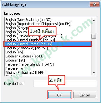 4. คลิกเลือก English (United States) [en-US] จากนั้นก็คลิกปุ่ม OK
