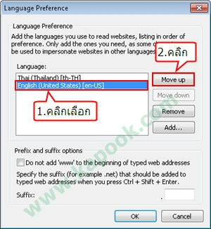 5. ตอนนี้ได้ภาษา English เข้ามาแล้ว ขั้นตอนต่อไปคือ ย้ายไปอยู่ลำดับบนสุดครับ โดยคลิกที่ Enlish.. จากนั้นก็คลิกที่ ปุ่ม Move up ดังรูป