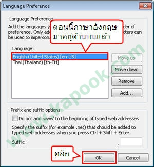 6. ตอนนี้ English ขึ้นมาอยู่บนสุดแล้ว ให้ คลิก OK