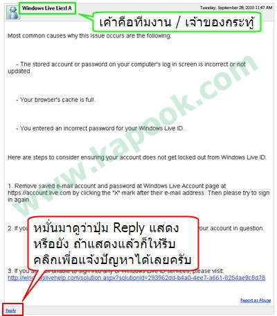 3. จะเห็นว่ากระทู้แรกสุดเป็นของคุณ Windows Live Liezl A ซึ่งเป็นทีมงานฮอตเมล์ ที่เราต้องทำคือให้มองดูว่ามีปุ่ม Reply อยู่ด้านล่างหรือไม่ ถ้ามีก็ให้รีบ ๆ คลิกแล้วเข้าไปโพสต์แจ้งปัญหาเค้าได้เลย แต่ถ้ายังไม่มีก็อย่าเพิ่งตกใจครับ ให้เราเข้ามาดูบ่อย ๆ เนื่องจากผู้ใช้ฮอตเมล์ที่มีปัญหาเดียวกับเรารอคิวให้ทีมงานแก้ไขกันเยอะมาก ระบบจึงต้องหยุดพักเป็นช่วง ๆ ครับ