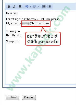 5.อันนี้เป็นตัวอย่างข้อความที่ได้โพสต์ขอความช่วยเหลือทีมงานฮอตเมล์ไปครับ สำหรับท่านuser ที่ไม่สะดวกจะพิมพ์ภาษาอังกฤษหรือภาษาอังกฤษไม่แข็งแรง ก็ให้ไปก็อบข้อความคนอื่น แล้วเอามาเปลี่ยนชื่อกับอีเมล์ (ที่ติดปัญหา) ของเราก็ได้ครับ แต่ถ้าเป็นไปได้ก็ควรพิมพ์เองดีกว่านะครับ เสร็จแล้วก็ให้คลิกปุ่ม Submit ทำการโพสต์ได้เลย