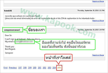 ขั้นตอนต่อไป จะเป็นการเข้าไปโพสต์แจ้งปัญหากับทีมงานฮอตเมล์ ซึ่งจะเป็นภาษาอังกฤษล้วนๆ และเราก็ต้องโพสต์แจ้งเค้าเป็นภาษาอังกฤษด้วยเช่นกัน สำหรับเพื่อน ๆ ที่ไม่ค่อยจะถนัดภาษาอังกฤษก็ให้ Copy ข้อความคนอื่นไปแปะ แล้วเปลี่ยนชื่อกับอีเมล์ที่มีปัญหาเป็นของเราก็ได้ครับ