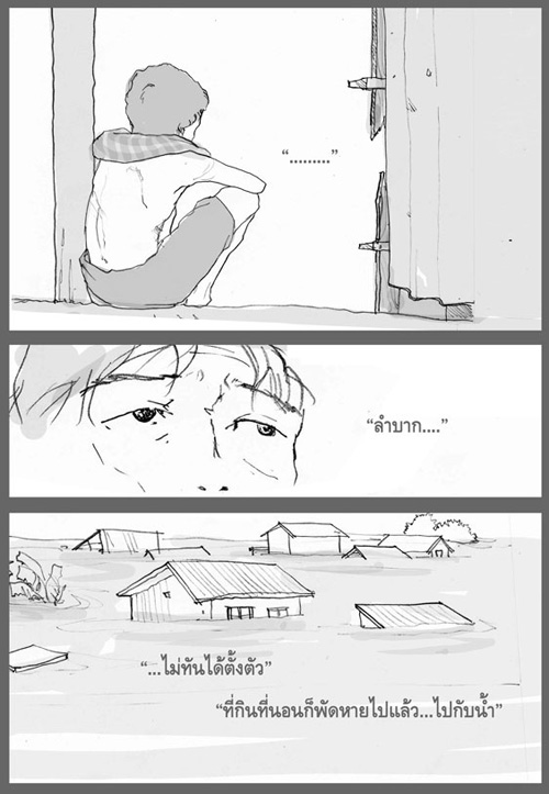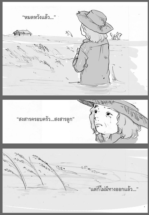 ผู้ประสบภัยหลายคนต้องทนเห็นบ้าน เห็นรวงข้าวที่กำลังจะเก็บเกี่ยว เห็นพืชผักผลไม้ที่กำลังจะผลิดอกออกผลจมน้ำไปทีละน้อย ๆ โดยที่ไม่สามารถทำอะไรได้ ขณะที่ข้าวของทรัพย์สินต่าง ๆ ในบ้านที่ขนย้ายขึ้นที่สูงไม่ทัน ก็ถูกกระแสน้ำเชี่ยวพัดพาหายไปต่อหน้าต่อตา