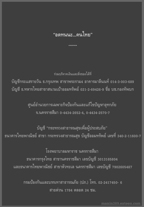 แม้ว่า "น้ำท่วม" อาจจะทำให้ผู้ประสบภัยต้องเสีย "น้ำตา" แต่ยังไม่ทันที่คราบ "น้ำตา" จะจางหาย"น้ำใจ" และ "ความร่วมมือร่วมใจ" จากทั่วทุกสารทิศ ก็ได้หลั่งไหลส่งมาถึงผู้ประสบภัยพร้อม ๆ กับสายน้ำที่ไหลเชี่ยว ต่างกันเพียงแค่ "สายธารแห่งน้ำใจ" ครั้งนี้มาพร้อมกับ "ความสุข" ,"ความหวัง" และ "กำลังใจ" ที่ฝากถึงผู้ประสบภัยทุกคน ขอให้อดทน สู้ต่อไป แล้วทุกสิ่งทุกอย่างจะผ่านพ้นไปได้อย่างแน่นอน