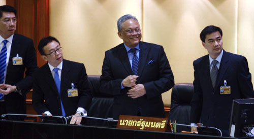 ทั้งนี้ นายอภิสิทธิ์ เวชชาชีวะ นายกรัฐมนตรี ในฐานะหัวหน้าพรรคประชาธิปัตย์ พร้อมทีมกฎหมายของพรรค เดินทางมาถึงศาลรัฐธรรมนูญอย่างพร้อมเพรียงกัน อาทิ นายชวน หลีกภัย ประธานสภาที่ปรึกษาพรรค และหัวหน้าทีมกฎหมาย นายบัญญัติ บรรทัดฐาน กรรมการสภาที่ปรึกษาพรรคและทีมกฎหมาย เพื่อฟังการแถลงปิดคดีด้วยวาจา โดยนายกรัฐมนตรีมีสีหน้ายิ้มแย้ม เมื่อผู้สื่อข่าวพยายามสอบถามว่า มีความวิตกกังวลกับคดีดังกล่าวหรือไม่