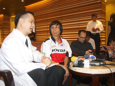 โดยทั้งหมดได้ร่วมแถลงข่าวอาการของ ฟีม รัฐภาคย์ วิไลโรจน์ นักบิดทีมไทยฮอนด้า พีทีที สิงห์ แซค ซึ่ง น.พ.มนตรี ลักษณ์สุวงศ์ ผู้ช่วยผู้อำนวยการด้านการแพทย์ โรงพยาบาลบำรุงราษฎร์ กล่าวว่า "ทางคณะแพทย์ได้เอ็กซเรย์คอมพิวเตอร์สมอง หรือ ซีที สแกน พบว่า สมองข้างขวามีรอยช้ำเล็กน้อย และสมองบวมร่วมด้วย และคนไข้ ยังมีไข้สูง"