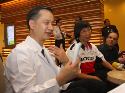 นายอารักษ์ พรประภา กรรมการผู้จัดการบริษัท เอ.พี.ฮอนด้า จำกัด ร่วมกับ มร.เอดูอาร์โด เปราเลส เจ้าของทีม สต็อป แอนด์ โก (แซค) จากประเทศสเปน และ น.พ.มนตรี ลักษณ์สุวงศ์ ผู้ช่วยผู้อำนวยการด้านการแพทย์