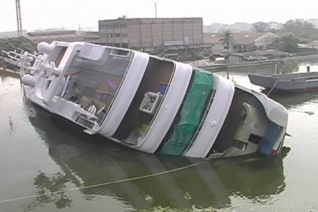 เรือยอร์ชหรู มูลค่าพันล้าน จมแม่น้ำท่าจีน ที่ จ.สมุทรสาคร สาเหตุ คาดความสูงของเรือไม่สมดุลย์กับน้ำหนักเรือ