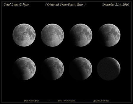 ภาพแสดงเงาของโลกค่อย ๆ เคลื่อนตัวบดบังดวงจันทร์จนมืดไปทั้งดวง