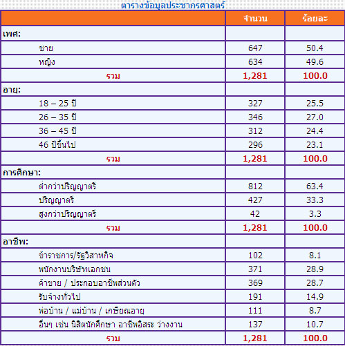 สรุปข้อมูลพื้นฐานของกลุ่มตัวอย่างดังนี้ :