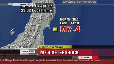 สำนักข่าว NHK รายงานว่า เมื่อคืนวันที่ 7 เมษายน เกิดแผ่นดินไหว ขนาด 7.4 ริกเตอร์ ในพื้นที่ทางตะวันออกเฉียงเหนือของประเทศ จุดเดียวกับที่เคยเกิดความเสียหายจาก แผ่นดินไหวและสึนามิถล่ม เมื่อวันที่ 11 มีนาคม ที่ผ่านมา ทำให้มีผู้เสียชีวิต 4 ราย เป็นชายวัย 79 ปี เสียชีวิต เพราะอาการช็อกอย่างรุนแรง อีกรายเป็นหญิงวัย 60 ปี เสียชีวิตเพราะถังออกซิเจนใช้การไม่ได้ เนื่องจากไฟฟ้าดับ อีกรายเป็นหญิงชรา วัย 83 ปี เสียชีวิตหลังส่งไปเข้ารับการรักษาที่โรงพยาบาลในจังหวัดมิยางิ และชายวัย 85 ปี ที่ยังไม่มีการเปิดเผยถึงสาเหตุการเสียชีวิต และมีผู้ได้รับบาดเจ็บประมาณ 140 คน