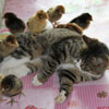 เมื่อวันที่ 24 พฤษภาคม เว็บไซต์ออเรนจ์นิวส์ ของอังกฤษ รายงานเรื่องสุดน่ารักของแม่แมวเหมียว ซึ่งต้องทำหน้าที่เลี้ยงลูกเจี๊ยบทั้งคอก เนื่องจากเจ้านายต้องออกไปทำงานนอกบ้าน ที่มณฑลเฮยหลงเจียง ประเทศจีน