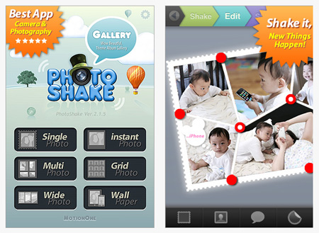 แอพพลิเคชั่นที่ใช้ตกแต่งภาพที่มี User Interface สวยงาม และมีลูกเล่นสุดเจ๋ง ใช้งานง่าย เพียงแค่ทำการเลือก Frame Style ไม่ว่าจะเป็นแบบสี่เหลี่ยม แบบแนวตั้งและแนวนอน ที่ผสมผสานเอารูปหลาย ๆ รูปมาเรียงกัน หลังจากนั้นเลือกรูปจากการถ่ายหรือในเครื่องของเรา และทำการ "Shake" หรือเขย่า เพียงเท่านี้ภาพเหล่านั้นก็จะถูกนำมาจัดเข้ากับ Frame Style ที่เราได้เลือกไว้อย่างสวยงาม นอกจากนี้ยังมีหมวด Edit เพื่อตกแต่งรูป เช่น เลือกแบบของกรอบรูป ว่าจะเหลี่ยม หรือจะมนดี สามารถเลือกสีของกรอบรูป รวมถึงลวดลายต่างๆ บนกรอบ รวมถึงการใส่ข้อความเพิ่มเติมไปในภาพ เป็นต้น เสร็จแล้วก็อย่าลืมแชร์ไปให้เพื่อนๆ ดูได้อีกด้วย ทั้ง Facebook, Twitter และ อื่นๆ อีกมากมายจ้า
