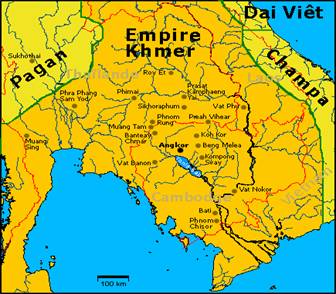 แผนที่จักรวรรดิขแมร์ประมาณ พ.ศ. 1443 (สีแดง)