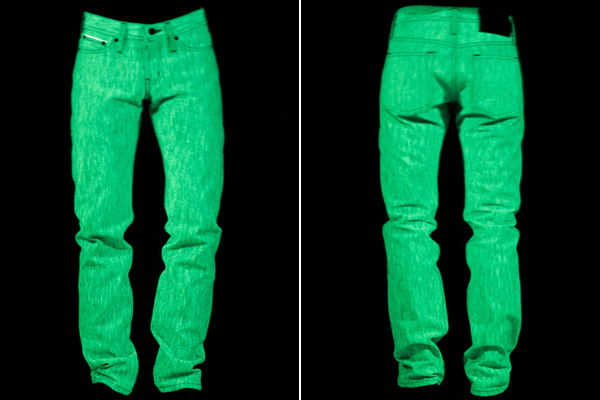 กางเกงยีนส์เรืองแสงที่ว่านี้เป็นของยี่ห้อ "Naked & Famous" ที่ใช้เนื้อผ้าแบบ "เดนิม" (Denim) มีคุณสมบัตินิ่ม โปร่งสบาย ระบายความร้อนได้ดี มาใช้เป็นวัสดุหลักและผสมสารเรืองแสงลงไปในเนื้อผ้า ซึ่งจะทำปฏิกิริยาตอบสนองในที่มืด ดังนั้นเวลาที่คุณใส่ไปเที่ยวหรือเข้าผับยามค่ำคืนแล้วล่ะก็ กางเกงยีนส์ตัวนี้จะทำให้คุณได้เป็นคนเด่นคนดังขึ้นมาทันตาเห็นด้วยแสงสะท้อนสีเขียวแบบเจ็บจี๊ด โดนใจ !!