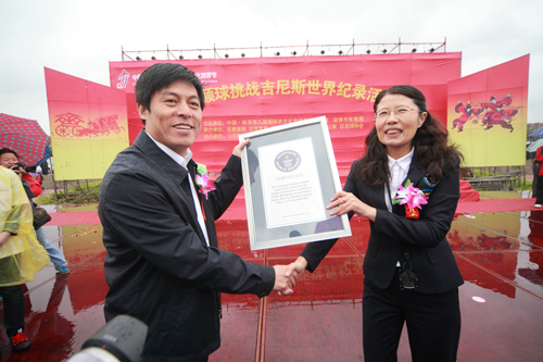 สถิติการใช้คนเดาะลูกฟุตบอลมากที่สุดในโลกในครั้งนี้ มีขึ้นที่เมืองหลิงซือ ในมลฑลซันตง ของประเทศจีน ซึ่งที่เมืองแห่งนี้เป็นที่ว่ากล่าวต่อ ๆ กันมาว่า เป็นต้นกำเนิดของกีฬาฟุตบอลในจีน นี่เองเลยทำให้ทางหน่วยงานราชการของเมืองเกิดไอเดียระดับโลก ด้วยการเลือกทำลายสถิติการใช้คนเดาะลูกฟุตบอลซะเลย
