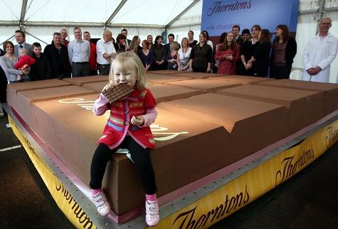 หลังจากผู้ผลิตขนมหวานรายใหญ่ของสหรัฐฯ เพิ่งจะทำช็อกโกแลตหนัก 5.5 ตัน ทำลายสถิติโลกไปหมาด ๆ เมื่อเดือนก่อน แต่ยังไม่ทันจะครบเดือน ดูเหมือนว่าตำแหน่งผู้ผลิตช็อกโกแลตที่ใหญ่ที่สุดในโลกนี้จะโดนโค่นซะแล้ว เมื่อผู้ผลิตช็อกโกแลตแดนอังกฤษอย่าง ธอร์นตันส์ ได้ทำช็อกโกแลตแท่งใหม่ใหญ่ยักษ์ที่หนักกว่า 6 ตัน ออกมาแสดงพลังความเป็นบริษัทช็อกโกแลตระดับโลกเป็นที่เรียบร้อยแล้ว