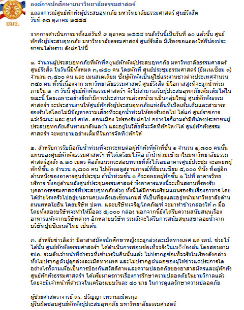 แถลงการณ์ศูนย์พักพิงผู้ประสบอุทกภัย มหาวิทยาลัยธรรมศาสตร์ ศูนย์รังสิต