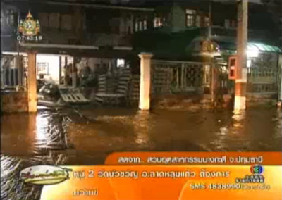 ส่วนทางด้านน้ำในคลองประปา ก็ยังเพิ่มระดับสูงขึ้นอย่างต่อเนื่อง ทั้งนี้เป็นเพราะน้ำจากคลองเชียงราก ไหลเข้ามาตลอดแนวคลองประปาด้านหลังสวนอุตสาหกรรมเป็นทางยาวกว่า 3 กิโลเมตร และได้เอ่อล้นจนชุมชนรอบข้าง ทั้งถนนติวานนท์ ถนนซ่อมสร้าง และถนนปทุมธานี-รังสิต โดยขณะนี้มีระดับน้ำประมาณ 10 - 20 เซ็นติเมตร รถเล็กไม่สามารถสัญจรได้