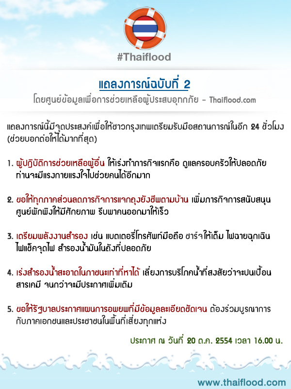 แถลงการณ์ฉบับที่ 2 โดยศูนย์ข้อมูลเพื่อการช่วยเหลือผู้ประสบอุทกภัย - Thaiflood.com