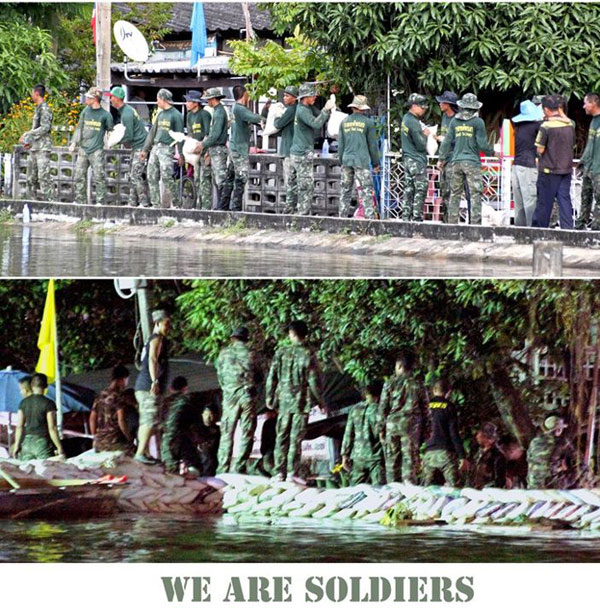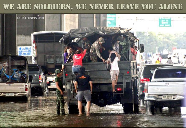 โดยเฉพาะกลุ่มคนกลุ่มหนึ่ง ที่ตั้งแต่เกิดวิกฤติการณ์น้ำท่วม พวกเขาไม่เคยทิ้งเรา คอยอยู่ข้างเรามาตลอด และยื่นมือช่วยเหลือโดยที่ไม่ปริปากบ่นเลยสักครั้ง... พวกเขาเหล่านั้นก็คือ "ทหาร" .... สิ่งที่เขาทำมันไม่ใช่เพียงหน้าที่ แต่มันเป็นสิ่งที่เขาทำด้วยใจ เพราะทุกลมหายใจเข้าออกของพวกเขา นั้นก็คือ "การดูแลประชาชน" และไม่ว่ามันจะต้องแลกมาด้วยหงาดเหงื่อแรงกายสักเท่าไร แต่เพื่อให้ประชาชนได้คลายกังวล นอนหลับสบาย และถึงจุดหมายปลายทางอย่างปลอดภัย เขาก็พร้อมและเต็มใจที่จะทำ ...