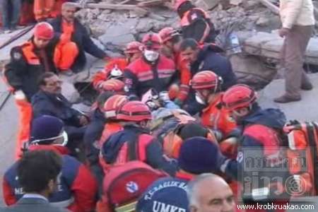 หน่วยกู้ภัยของตุรกี เร่งขุดค้นซากปรักหักพังของอาคารต่างๆ เพื่อช่วยผู้อาจรอดชีวิตที่ติดอยู่ หนึ่งวันหลังเกิดแผ่นดินไหวรุนแรง 7.2 ริกเตอร์ ทางภาคตะวันออกตุรกีติดพรมแดนอิหร่านเมื่อช่วงเย็นวันที่23 ต.ค. ที่ผ่านมาตามเวลาประเทศไทย ขณะที่ยอดผู้เสียชีวิตพุ่งขึ้นเป็น 280 ราย มีผู้บาดเจ็บอีกกว่า 1,000 คน โดยเจ้าหน้าที่ตุรกีคาดว่ายอดจะเพิ่มขึ้นอีกมาก จนทะลุ 1,000 ศพ เพราะยังมีผู้ติดอยู่ใต้ซากปรักหักพังอีกจำนวนมาก