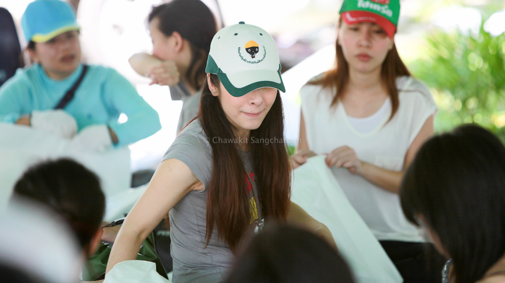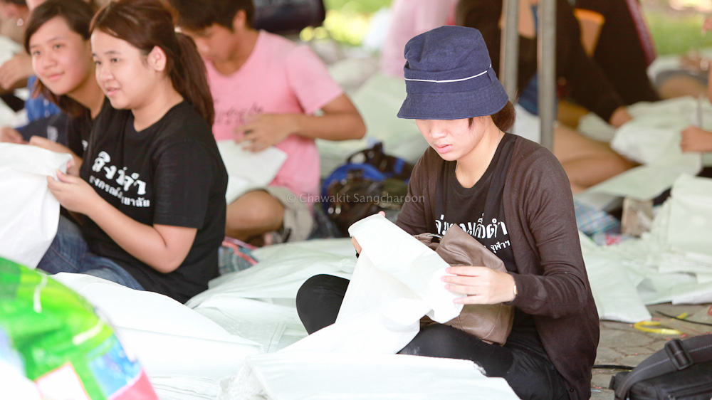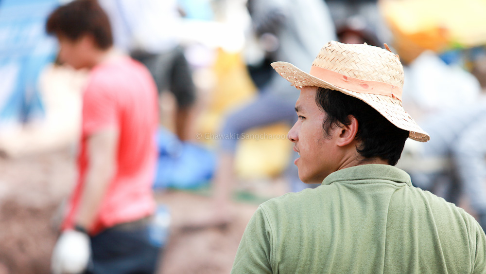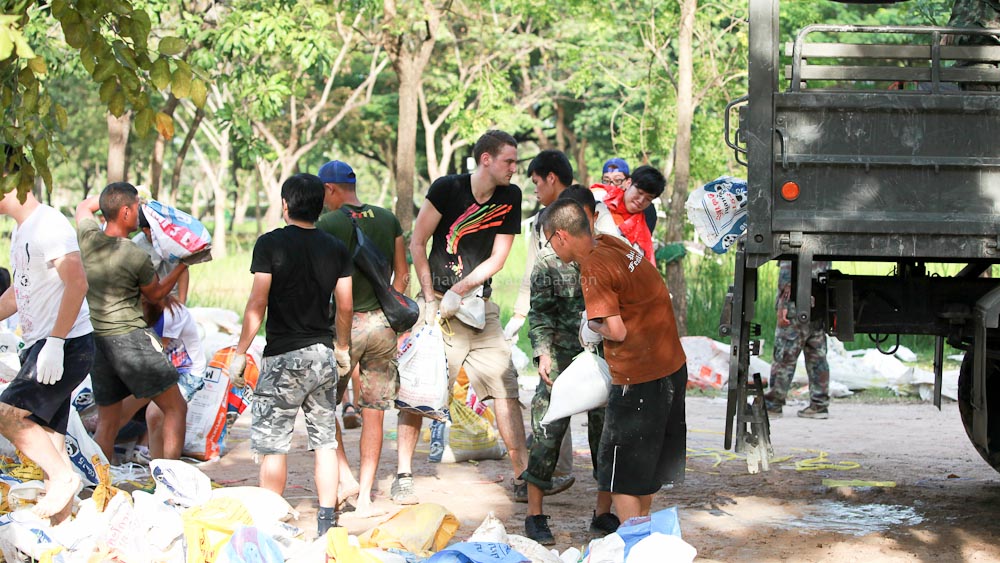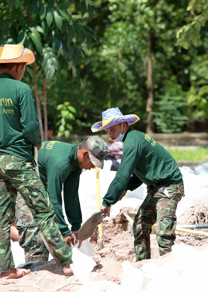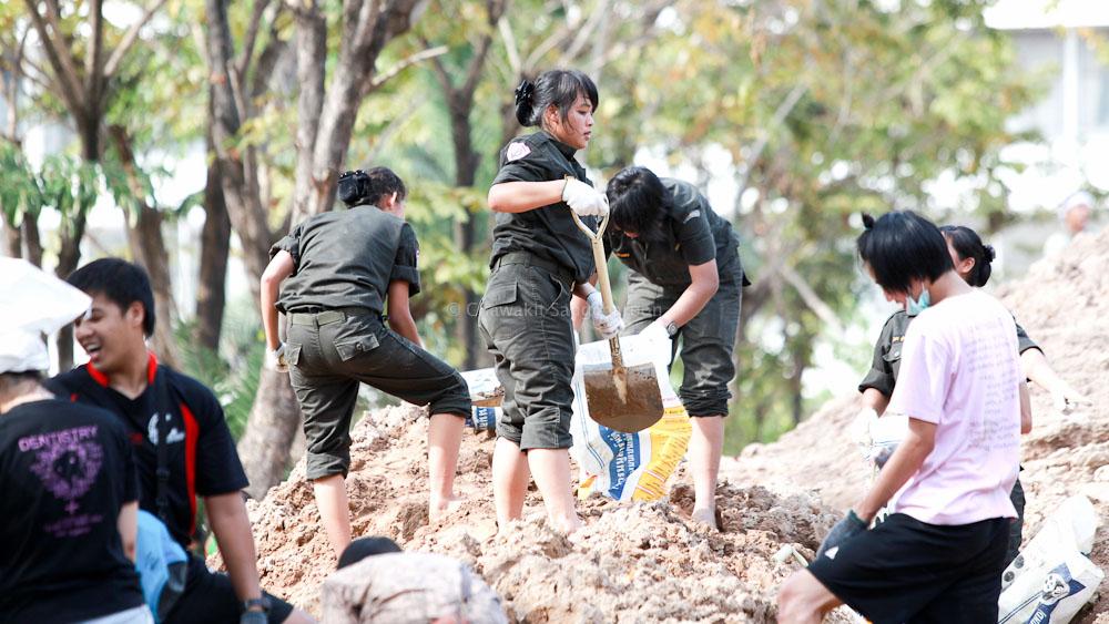 แรงงานที่อยู่กลางแดด ไม่ต้องแปลกใจนะครับว่าทำไมถึงสาว ๆ พอ ๆ กับหนุ่ม ๆ ทั้ง ๆ ที่ควรจะมีแรงงานชายมากกว่า คำตอบเรียบง่ายมากครับ ในช่วงแรก อาสาสมัครที่สาช่วยขุดทราย จะเป็นแรงงานชายมากกว่า และคนที่คอยมัดถุงจะเป็นแรงงานสาว ๆ แต่งานที่ต้องลำเลียงถุงทรายขึ้นรถ ขุดทราย เป็นงานที่ต้องใช้แรงเยอะมากครับ จนเวลาผ่านไปหลายวัน ทั้งแรงงานทหารและอาสาสมัครชายเริ่มจะไม่ไหวกัน จึงเป็นสาเหตุที่น้อง ๆ สาว ๆ ต้องออกมาช่วยกันครับ