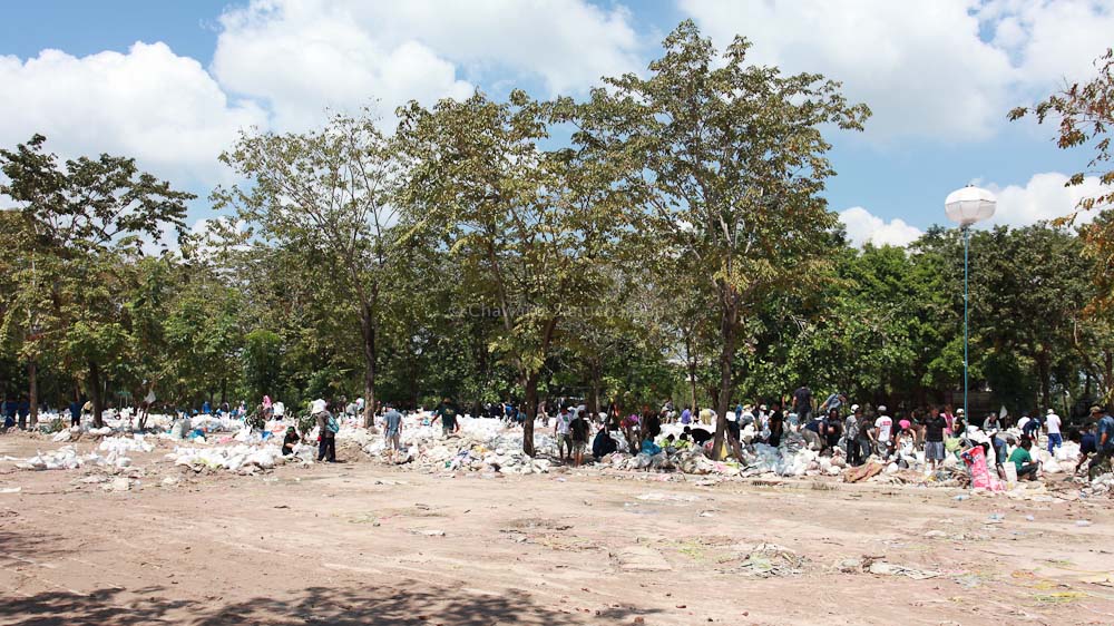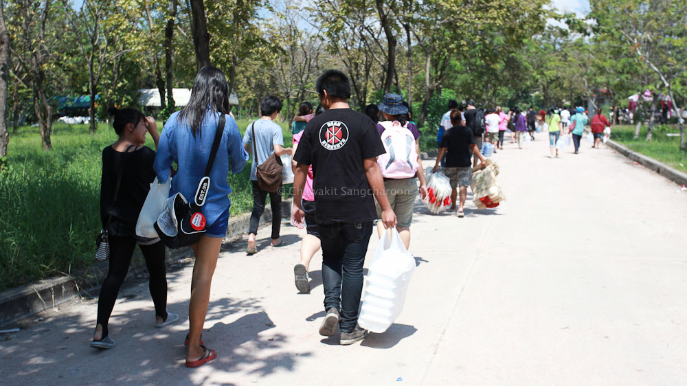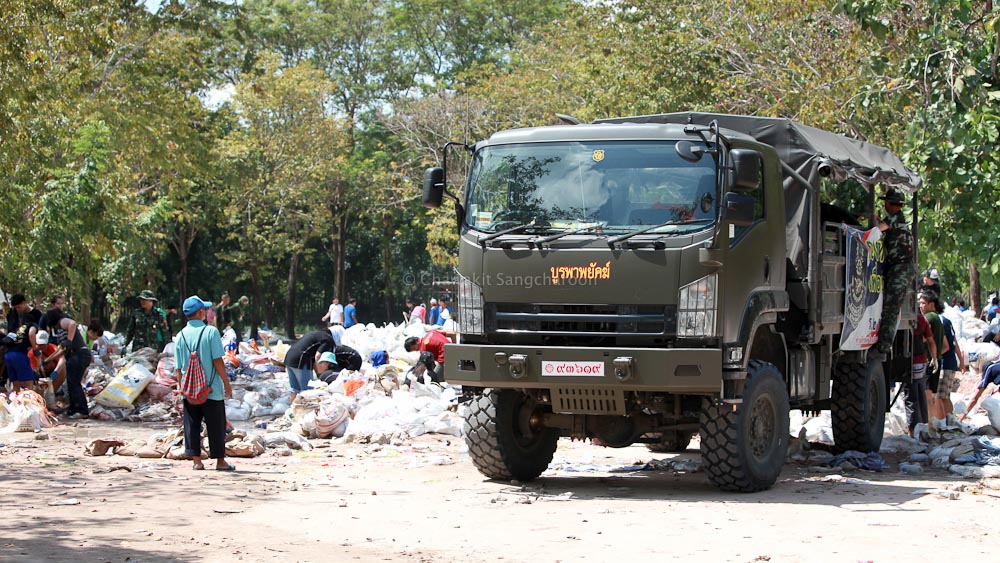 รถบรรทุกที่บรรจุกระสอบทรายออกไปช่วยเหลือตามพื้นที่กรุงเทพด้านเหนือ และบริเวณรอบ ๆ กว่าสองล้านกระสอบออกเดินทางจากที่นี่แหละครับ